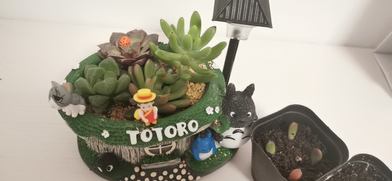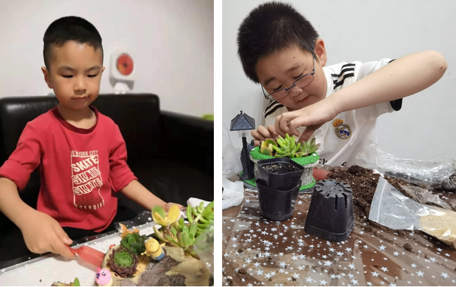 多肉植物种类繁多,有晶莹剔透的玉露、典雅高贵的紫珍珠,还有手指样的小多肉等等。园艺老师耐心地讲解多肉的种类,以及如何浇水、养护,孩子们一边听讲,一遍实践,兴致勃勃地参与到盆栽制作的每个环节。孩子们掌握了将多肉植物移植到各式各样俏皮可爱的花盆房里,并搭配上装饰品。这样一个个赏心悦目的趣味盆栽便映入眼帘,快来看看小生医工人的作品吧!